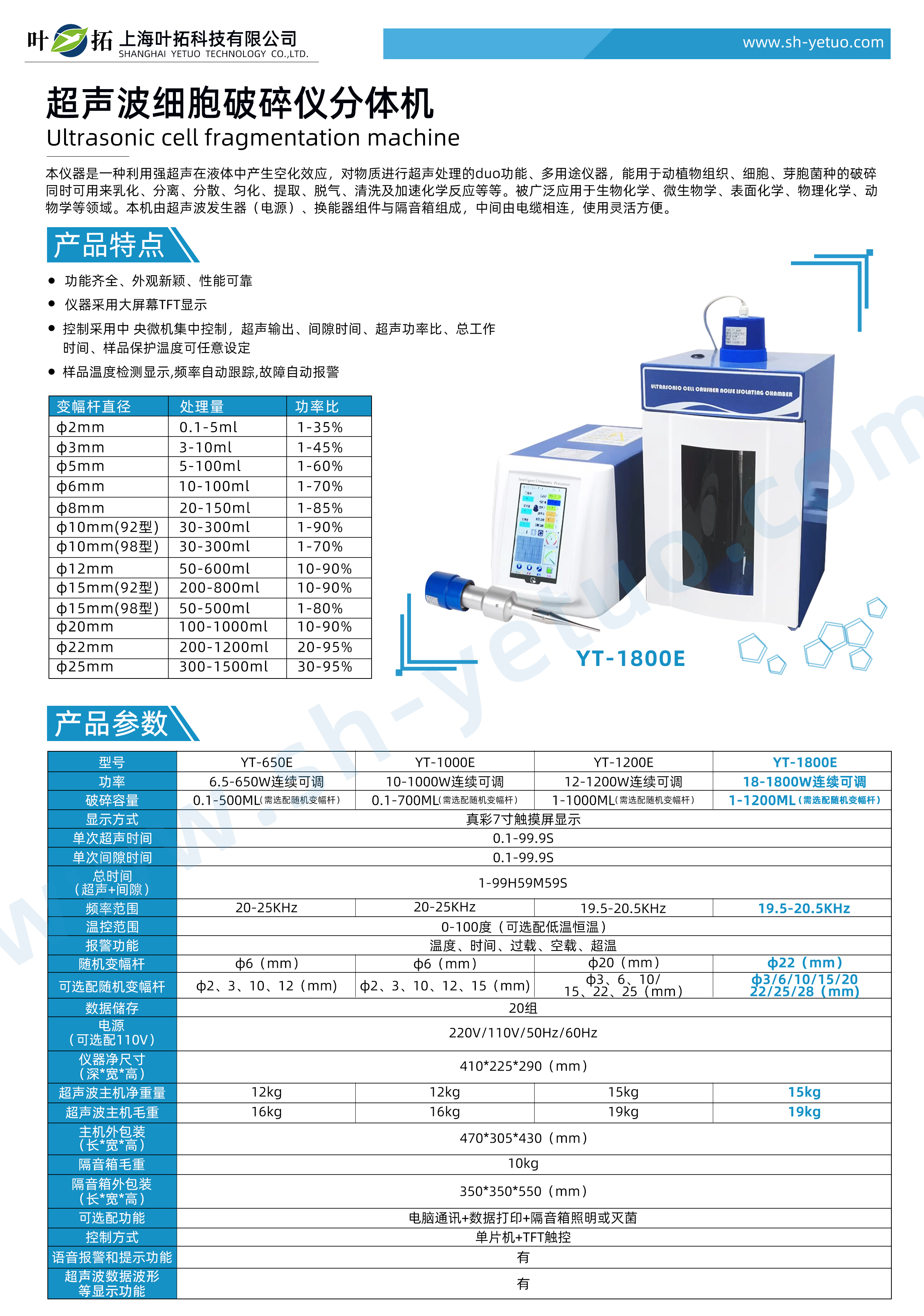 Product features of Yetuo YT-1800E split type ultrasonic cell disruptor