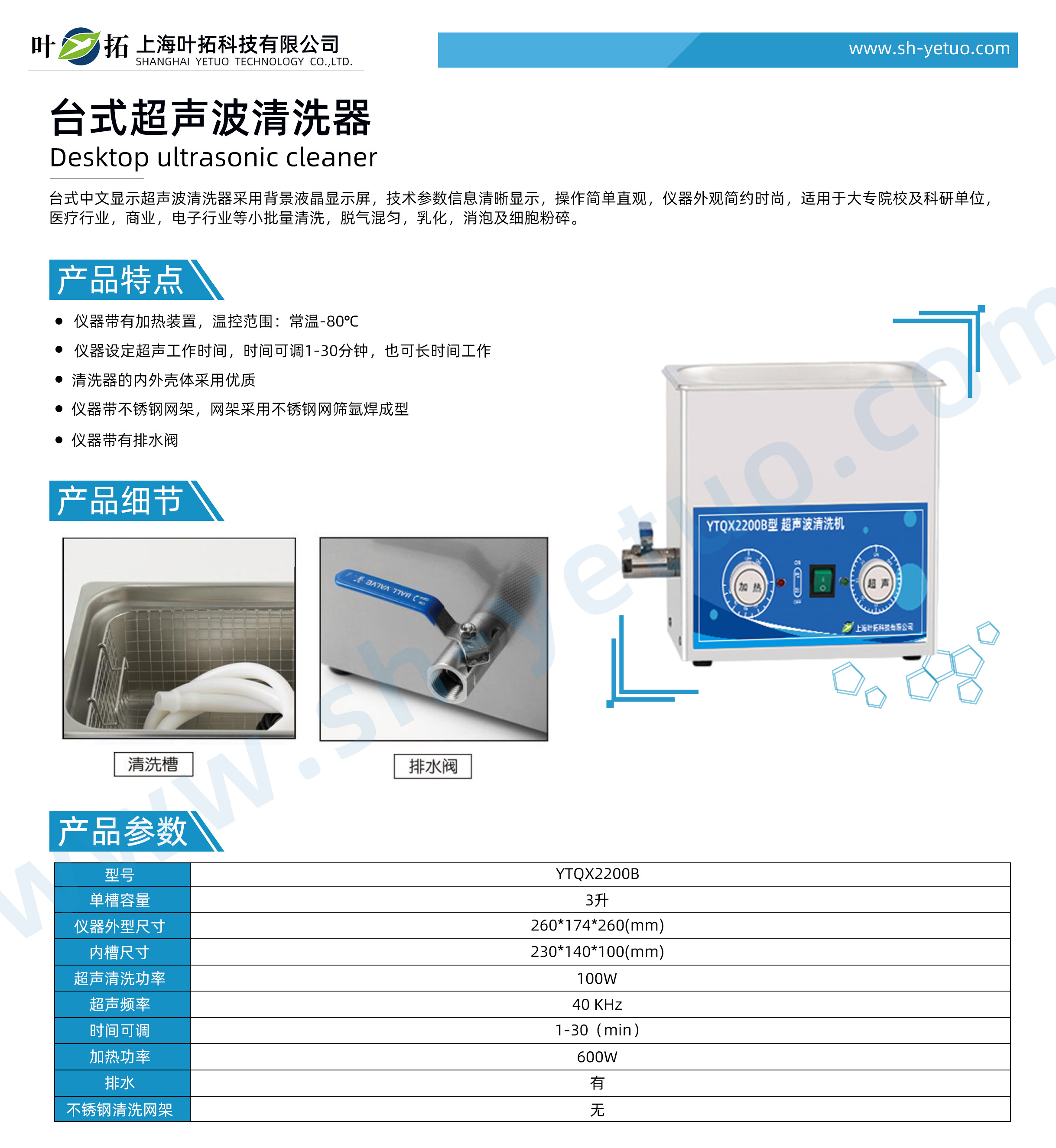 葉拓 YTQX2200B 臺式超聲波清洗機詳細參數