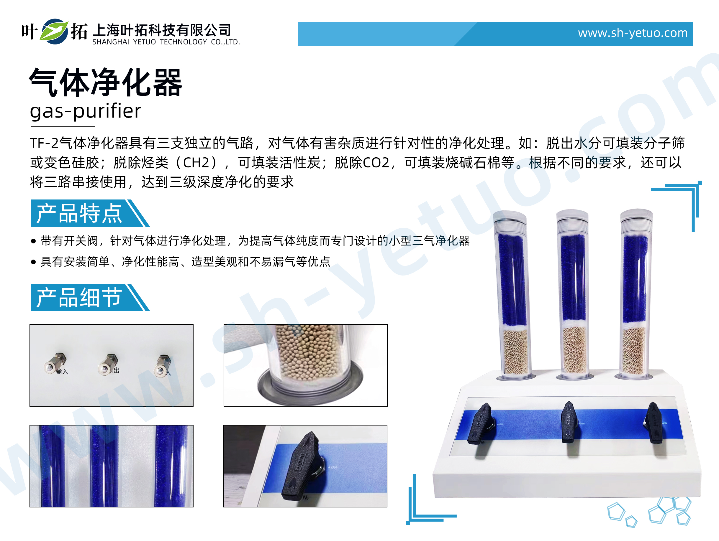 Product Overview: The TF-2 gas purifier has three independent gas paths, which provide targeted purification treatment for harmful impurities in the gas. For example, to remove moisture, molecular sieves or discolored silica gel can be filled, hydrocarbons (CH2) can be removed, activated carbon can be filled, CO2 can be removed, and alkali asbestos can be filled. According to different requirements, three channels can also be connected in series to meet the requirements of three-level deep purification.