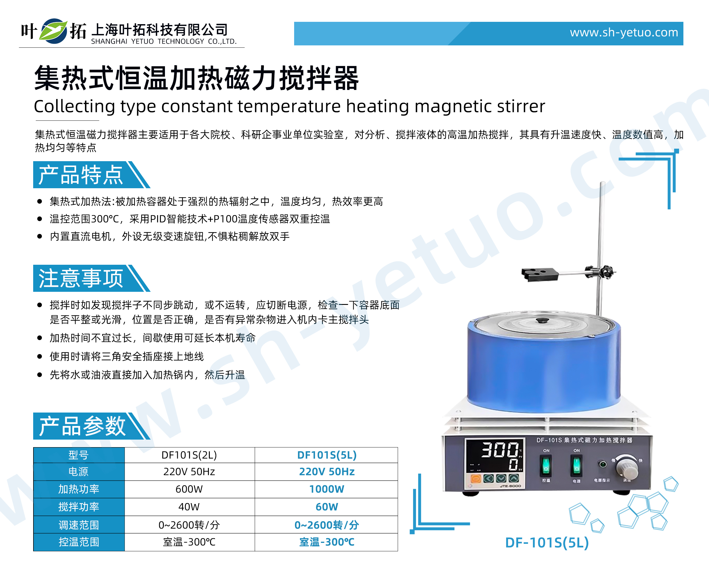 Product parameters: Model: DF-101S (5L) Power supply: 220V 50Hz Heating power: 1000W Mixing power: 60W Speed range: 0-2600 rpm Temperature control range: room temperature -300 ℃
